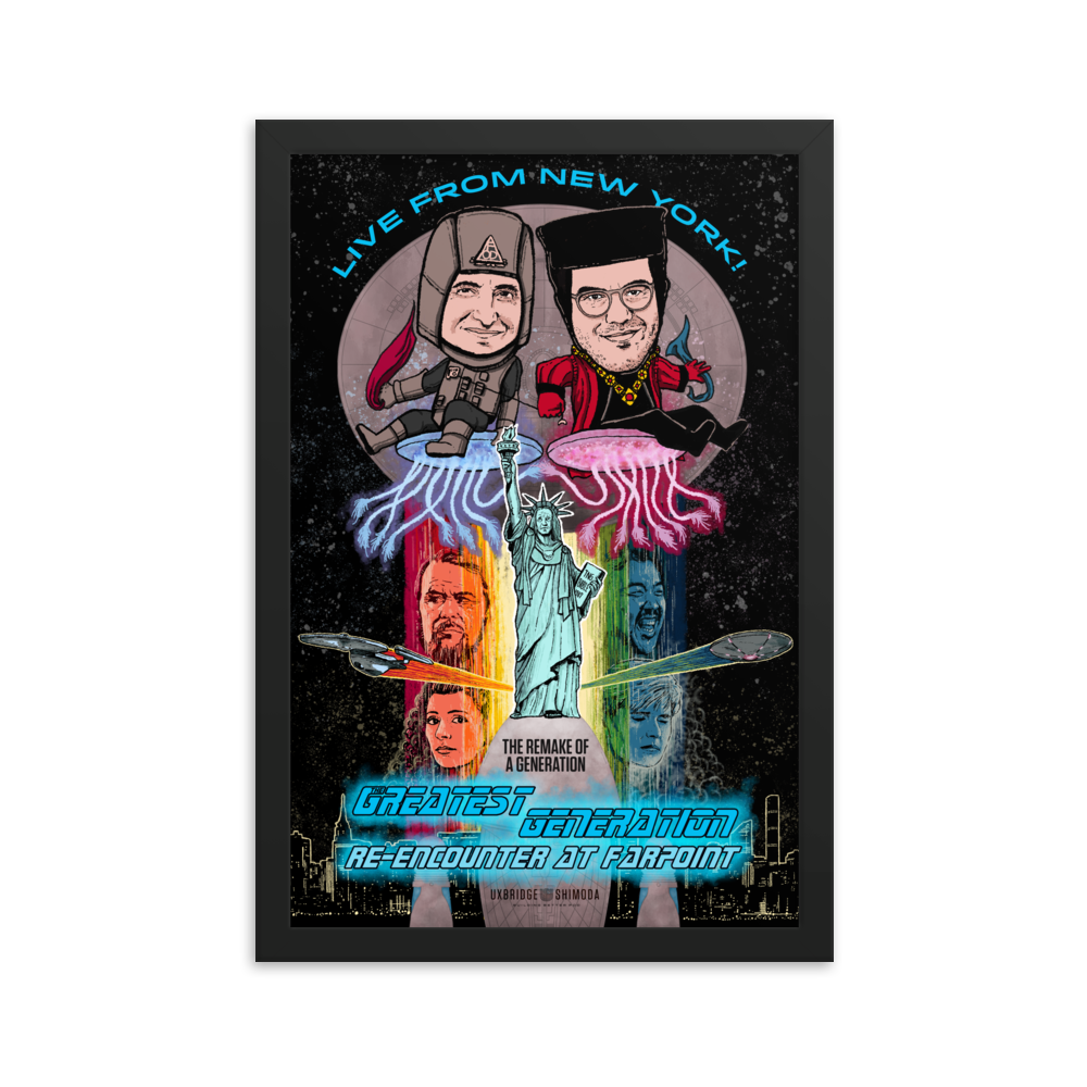 With great joy and gratitude, we have heard FoD’s requests loud and clear: a tour poster for our special Re-Encounter at Farpoint streaming show! Re-live all the excitement of seeing a live podcast at 3p on a Saturday, or sitting at home watching the show on your laptop or mobile device. This treasured memory will look great hung on a bathroom wall, or the back of most doors.